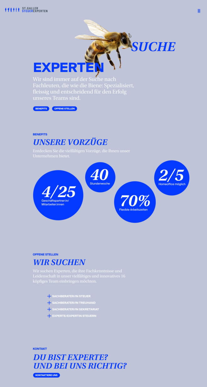 Ein Sprung in ein neues Zeitalter: der Web-Relaunch für die St. Galler Steuerexperten. Ein Auftritt, der die Expertise des Teams prägnant inszeniert. Dazu ein Bildkonzept, neue Porträtfotos und ein optimiertes Logo. Vor allem die Bilder heben sich von der Masse ab und strahlen Eigenständigkeit, Sympathie und Dialogbereitschaft aus. Dank neuer Briefschaften und der Beschriftung vor Ort ist zudem eine einheitliche und professionelle Aussenwirkung sichergestellt.